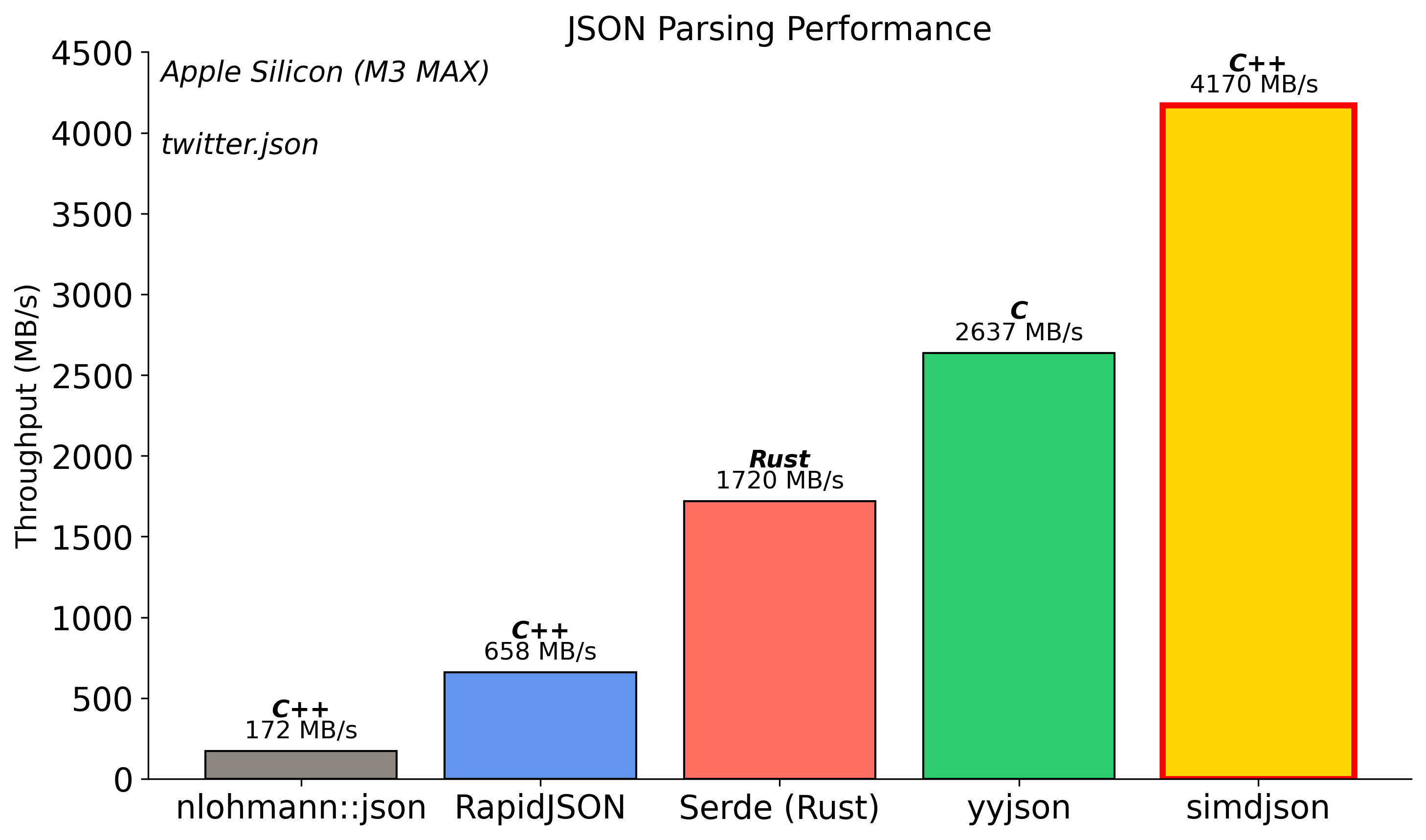 3.6 GB/s - 14x faster than nlohmann, 2.1x faster than Serde!